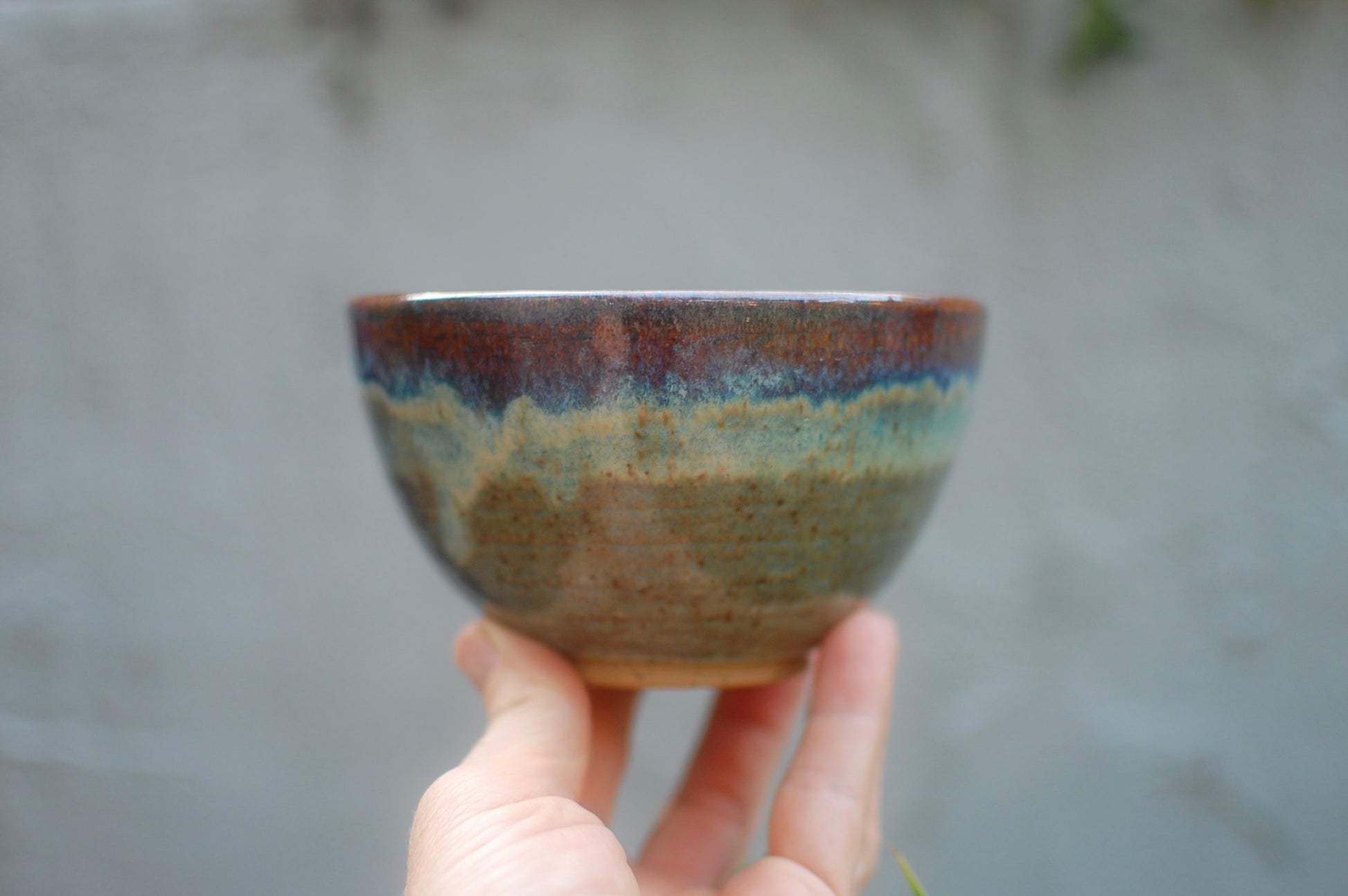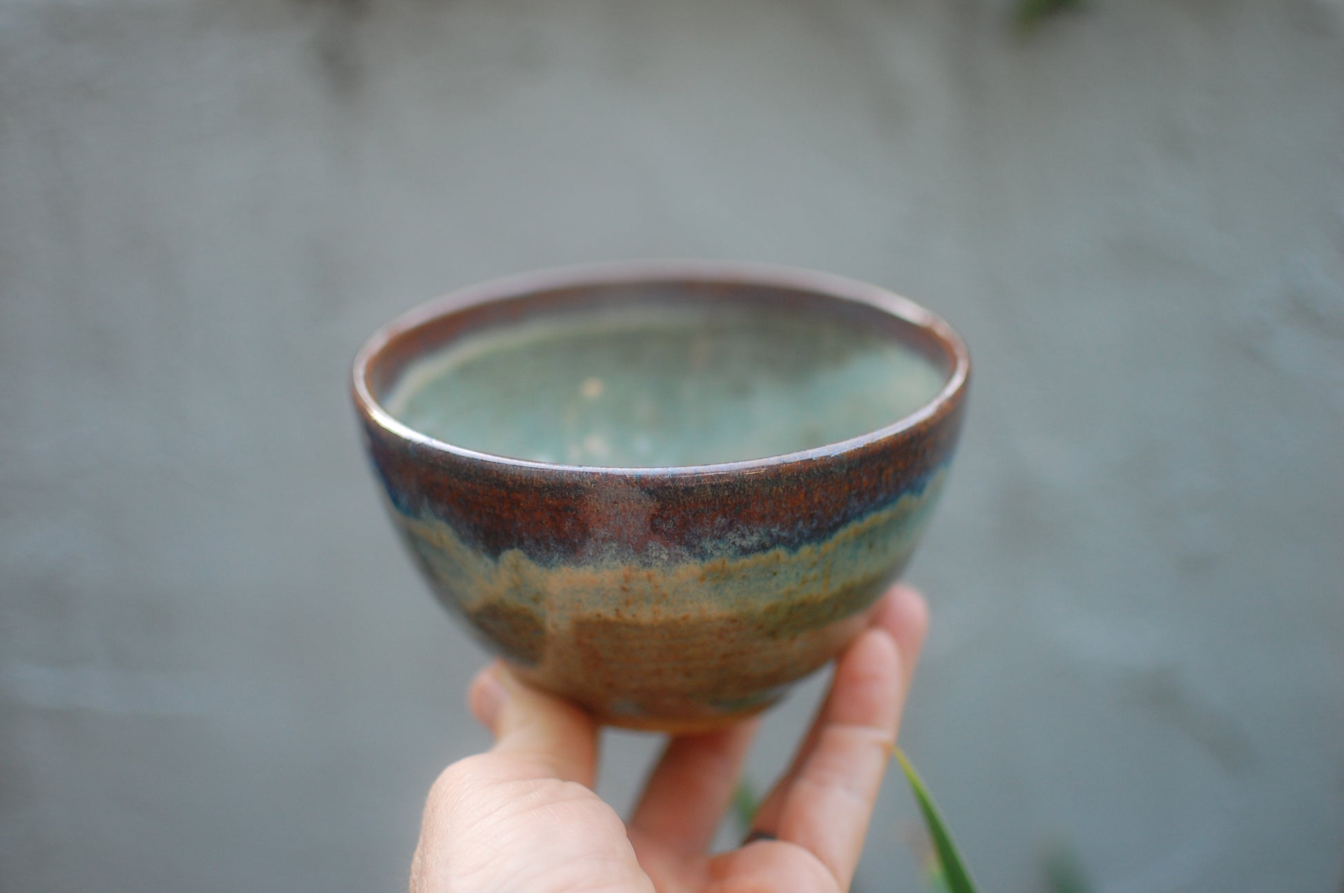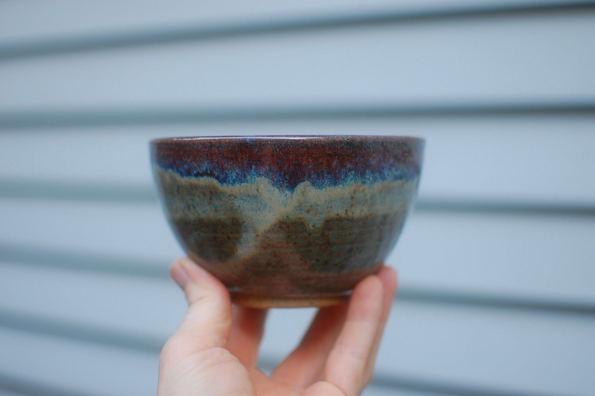 This bowl was thrown on the potters wheel, trimmed, fired, glazed and fired again. It's the perfect size for a bowl of cereal or yogurt with granola. It is 3 inches tall and 5 inches diameter at the rim.