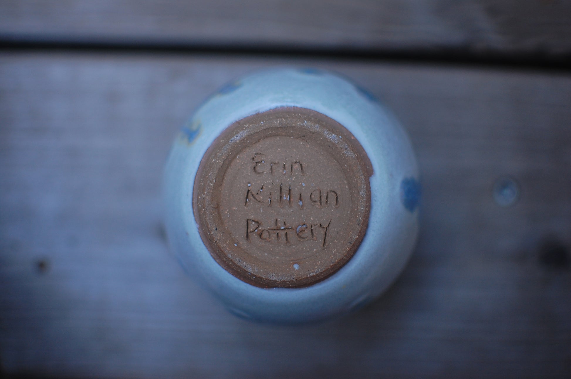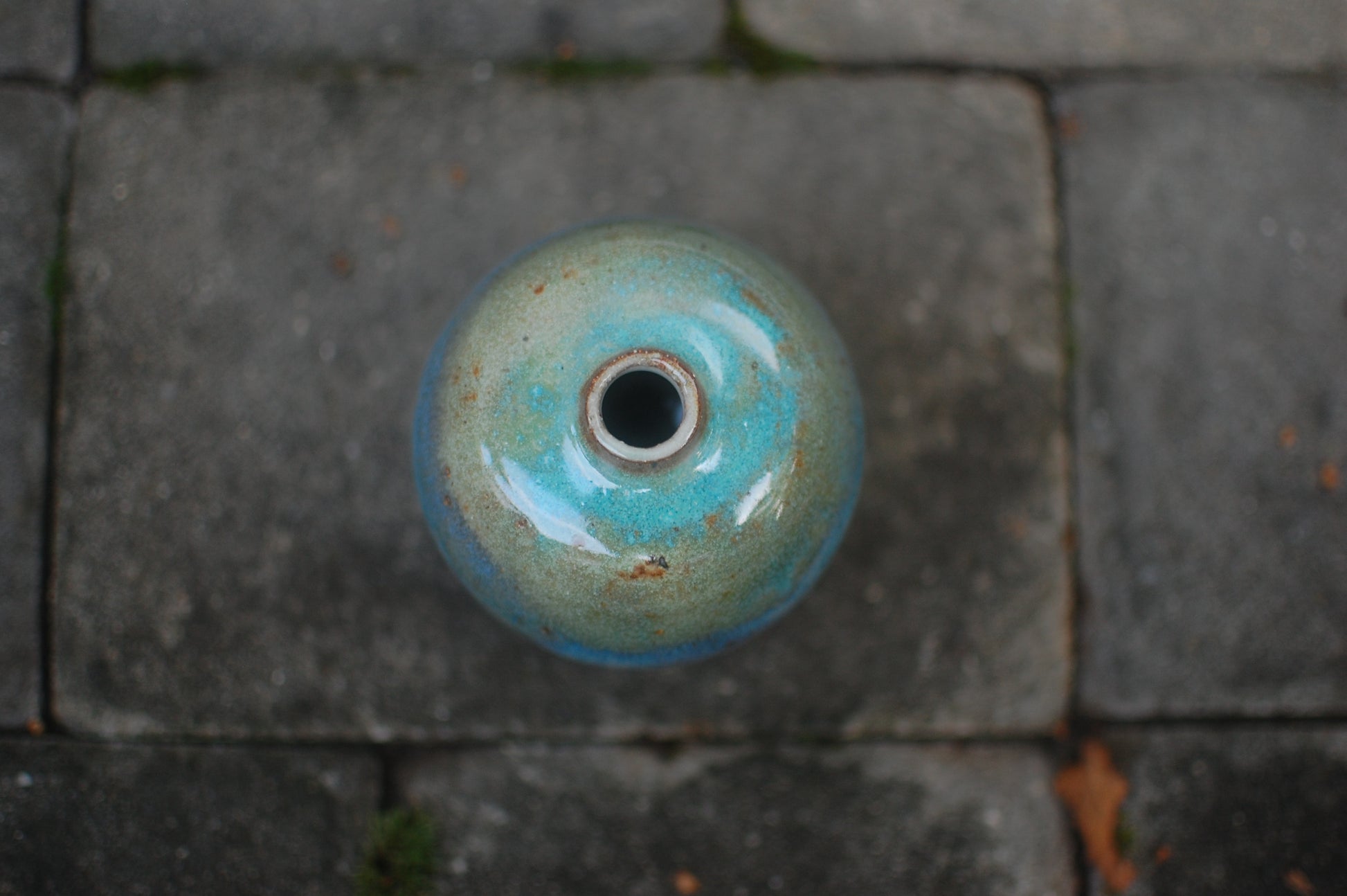 This vase was thrown on the potter's wheel with stoneware clay, trimmed, sanded, fired, glazed and fired again. It was glazed with blues and greens that run together to make a one-of-a-kind vase.