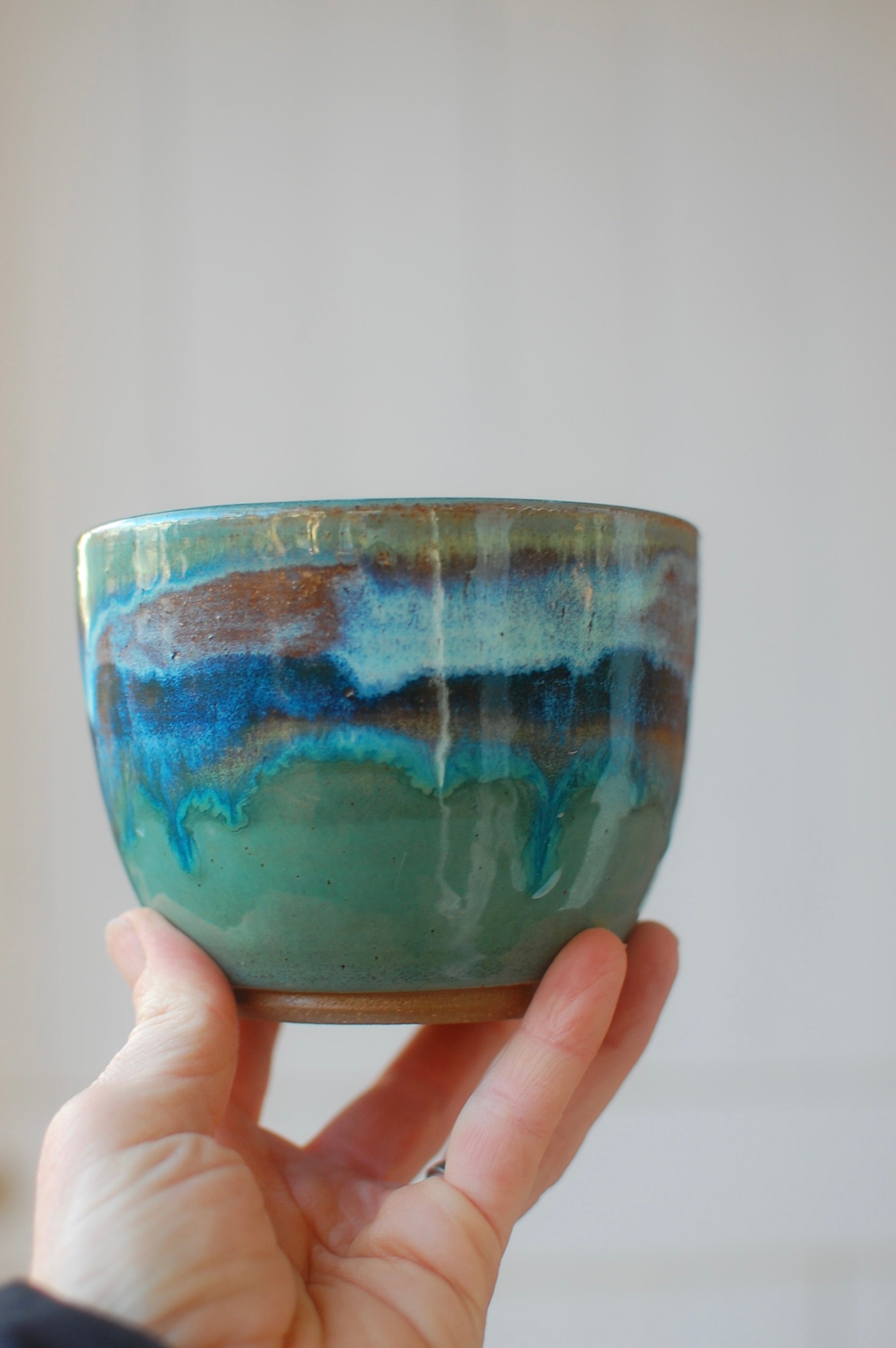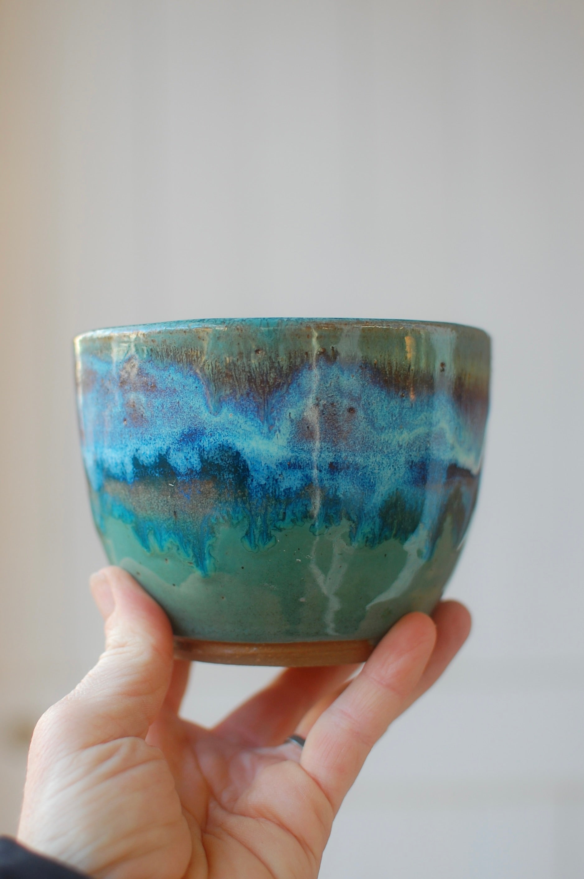 This bowl was thrown on the potters wheel, trimmed, fired, glazed and fired again. It's the perfect size for a bowl of cereal or yogurt with granola. It is 3 3/4 inches tall and 4 3/4 inches diameter at the rim.