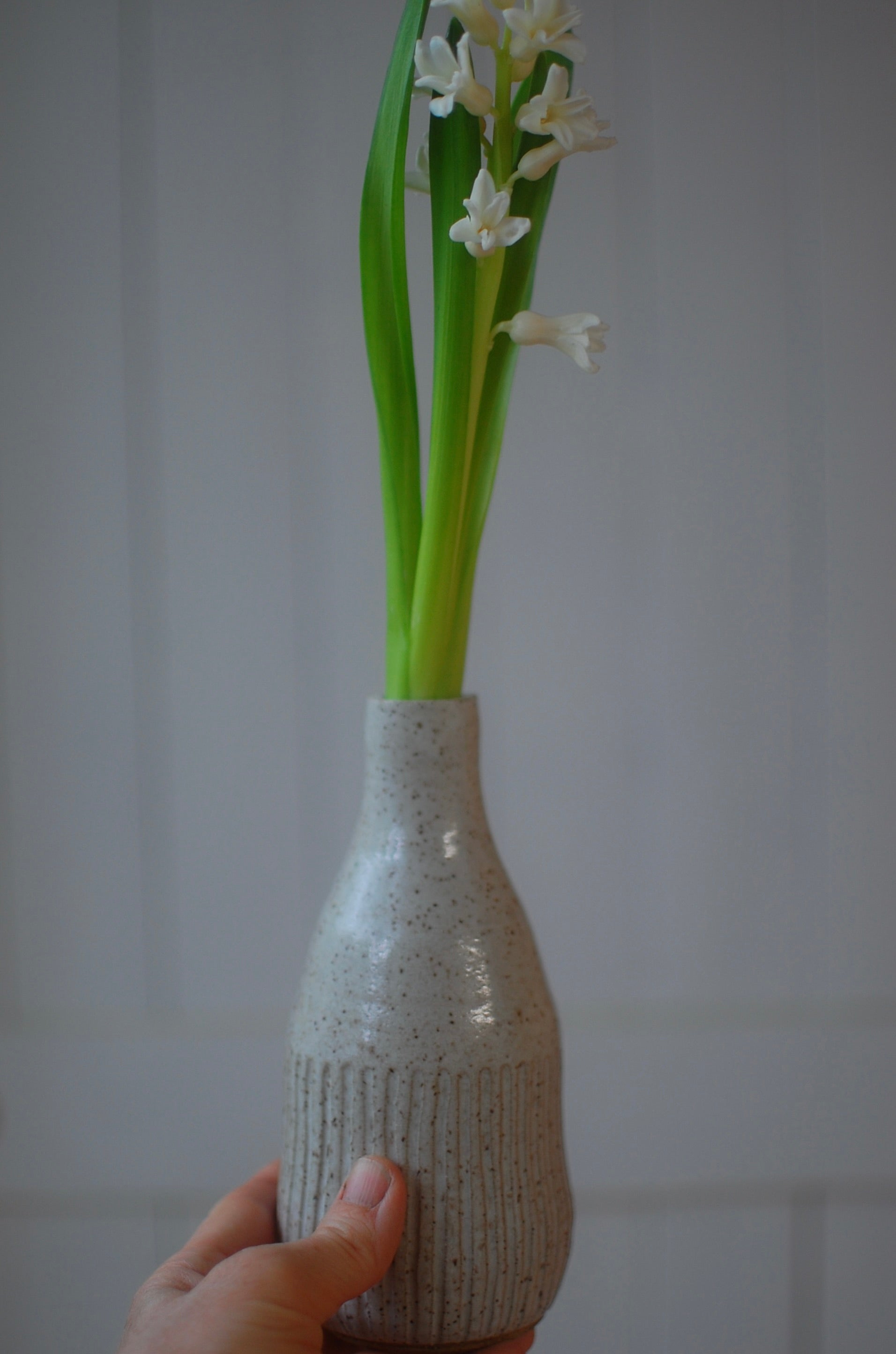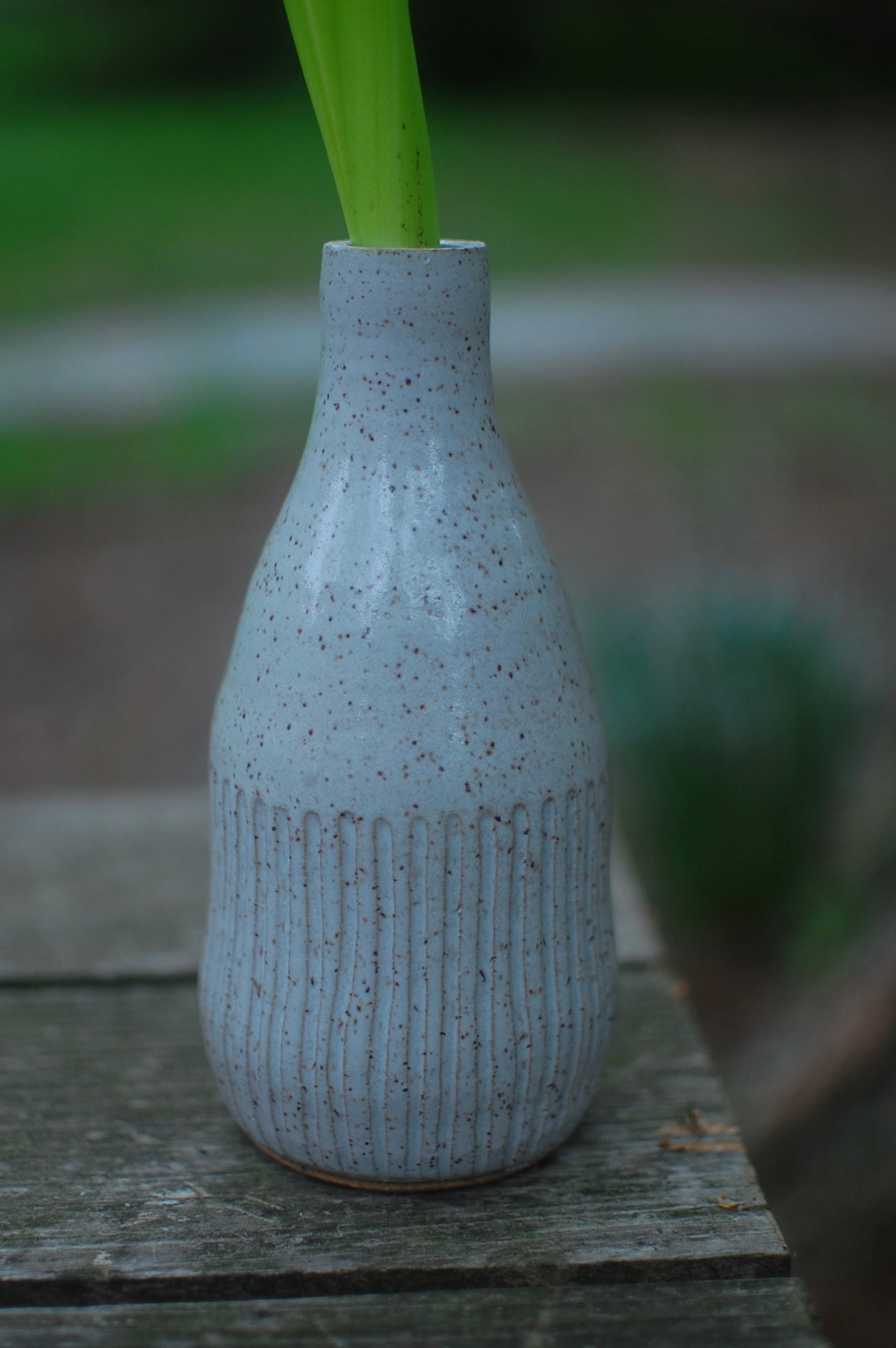 This vase was thrown on the potter's wheel with stoneware clay, trimmed, sanded, fired, glazed and fired again.